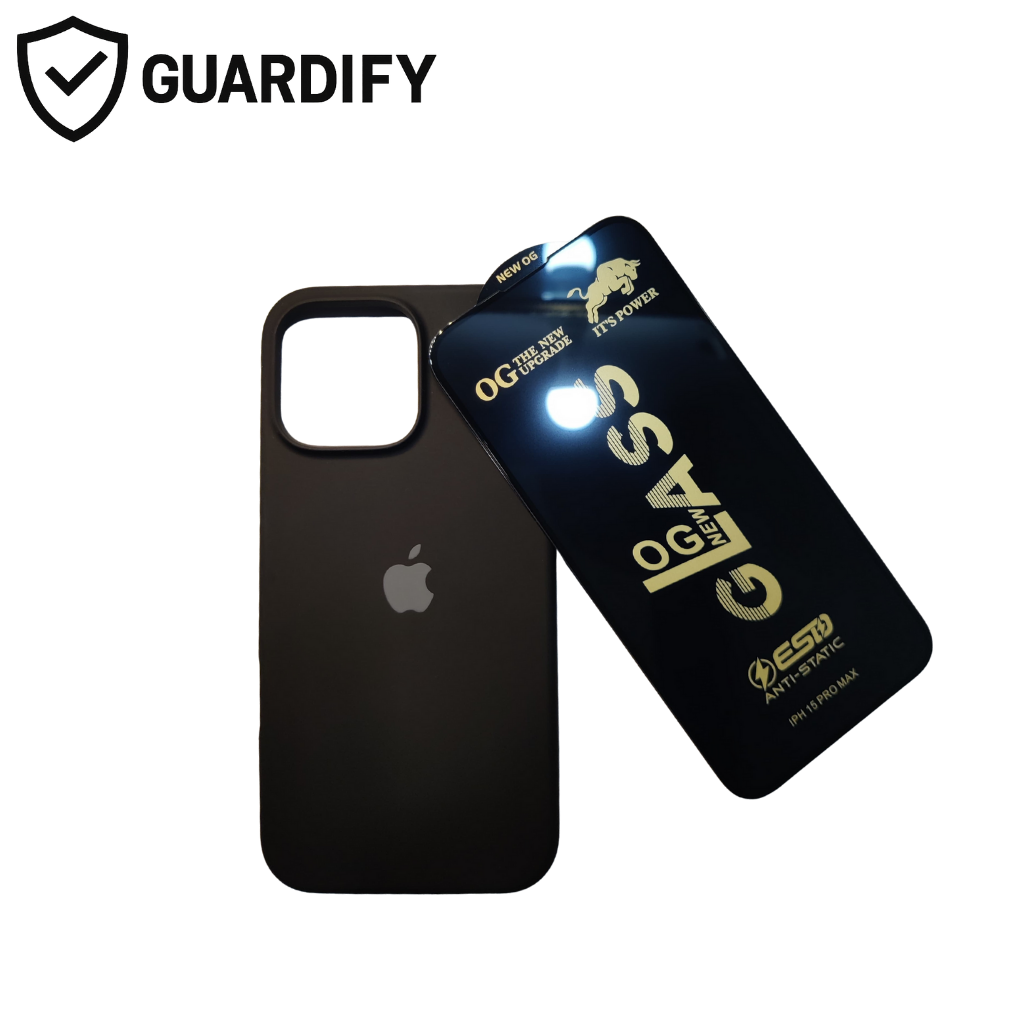 Upgrade your iPhone 15 Pro Max with the Guardify Silicone Case + OG Glass Bundle – stylish comfort and reliable protection.
